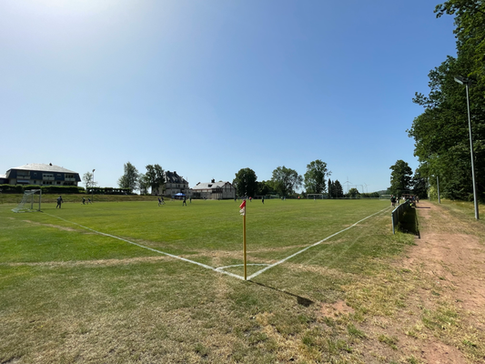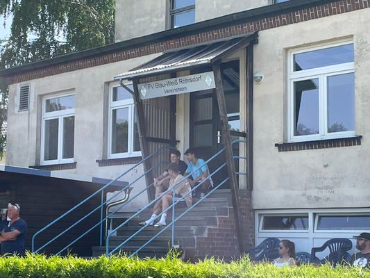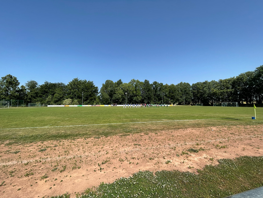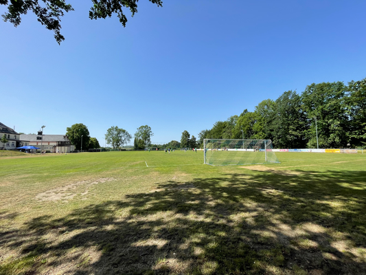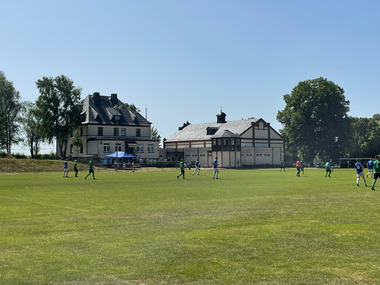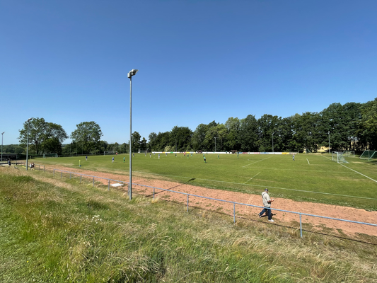 Der Wecker klingelte heute um 7:15 Uhr und als ich dann wach wurde, war Asche bereits ausgeschlafen im Bad. Ich folgte nach ihm dann mit der Dusche und zum Abschluss auch noch Micha. Auch wenn es mir nach den paar Bieren vom Vorabend nicht schlecht ging, tat diese Dusche dennoch sehr gut. Wie geplant verließen wir um 8:30 Uhr unsere Pension und tankten die Karre noch schnell voll bzw. kauften noch einen Kaffee und kalte Getränke. Zwar war unsere Wegstrecke nur ca. 85 Kilometer lang, aber quer durch das Erzgebirge war schon einiges an Zuckelerei, so dass das Navi uns anderthalb Stunden Fahrzeit vorhersagte, die wir am Ende auch brauchten. Wir kamen um 10:15 Uhr, also eine Viertelstunde vor Anpfiff, am Ground an. Direkt vor uns parkte Hopper-Kollege Thorsten Mankel ein, der aus dem Nordosten der Republik angereist war und am Eingang des Sportgeländes wartete auch bereits Hopper-Kollege Charly (Zwickau/Crimmitschau). Kurz begrüßt und gequatscht, kam mit Massa der nächste Hopper den Eingang herein. Schnell ein paar Fotos geschossen, verzogen wir uns umgehend ziemlich zügig in den Schatten hinter das eine Tor.