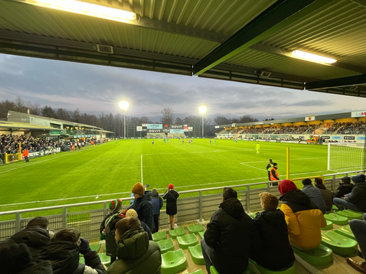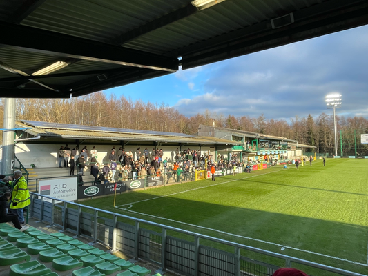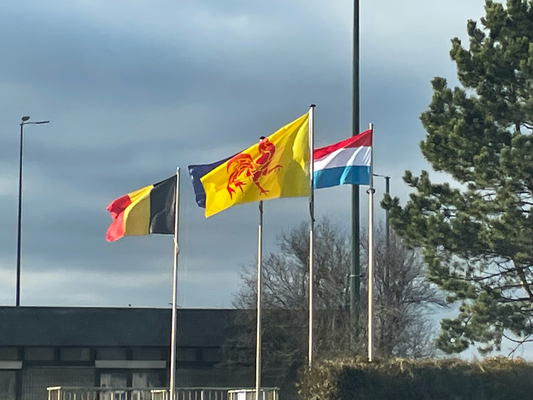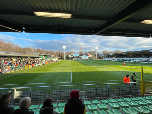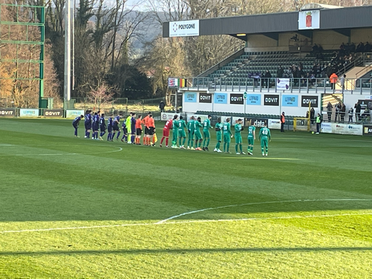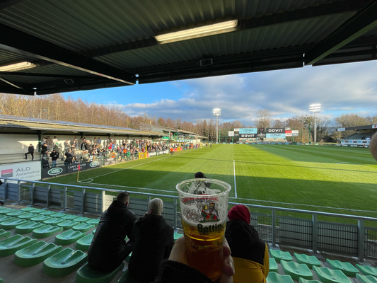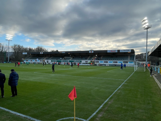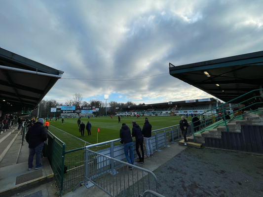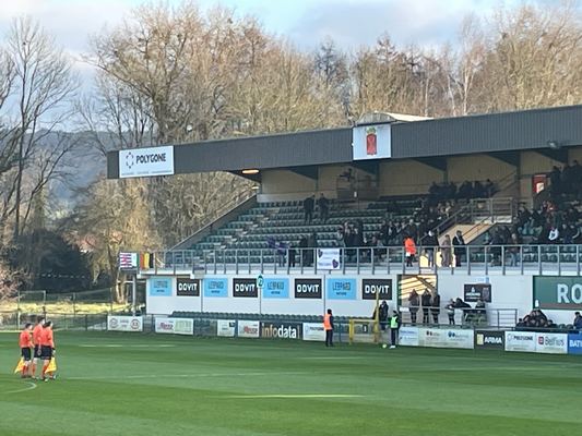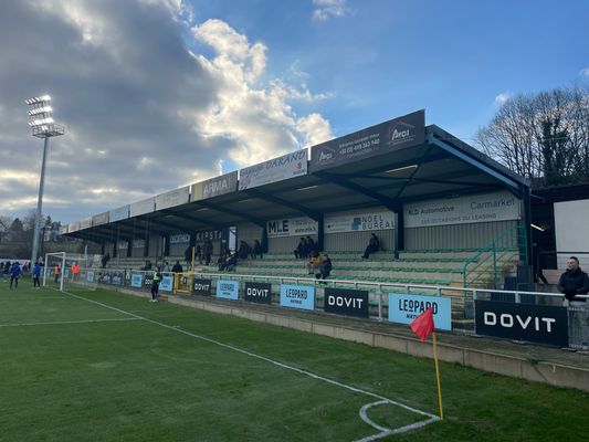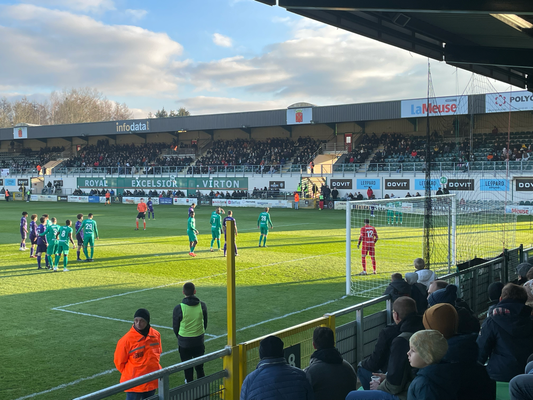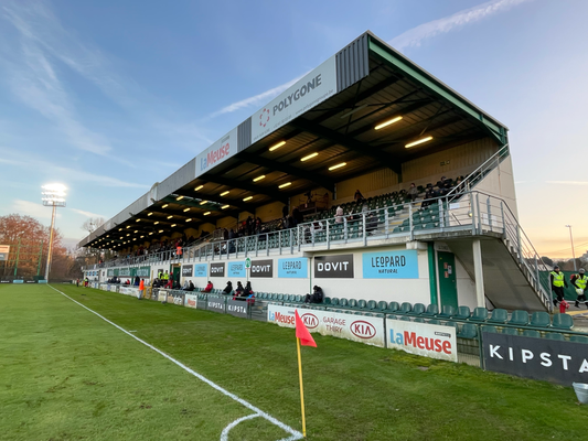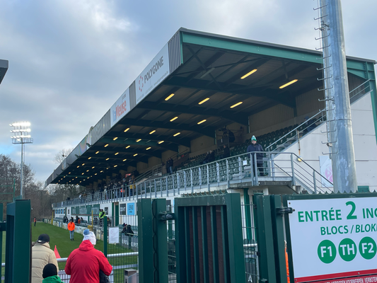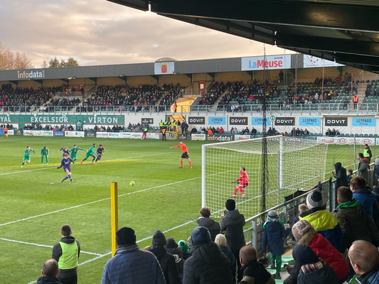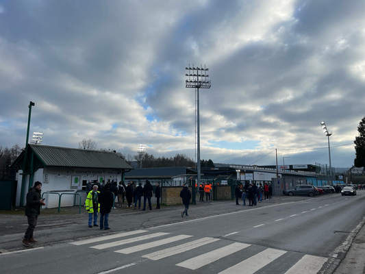 Die heutigen Spiele standen schon einige Wochen fest und obwohl nach und nach noch ein paar Terminierungen in allen möglichen anderen Ligen dazu kamen, hielt ich daran fest und änderte meine Pläne nicht nochmal um. OFC-Kollege Alex hatten schon vor Wochen großes Interesse bekundet und vor zwei Tagen meldete sich auch noch Tobi, so dass wir netterweise zu Dritt waren. Als Treffpunkt machten wir 11:30 Uhr an einem P&R-Parkplatz bei Limburg direkt an der A3 aus und ich war nach knapp 90 Kilometern sogar fünf Minuten zu früh da. Alex wartete bereits schon, obwohl er nur eine handvoll Kilometer entfernt wohnt. Tobi kam hingegen minimal verspätet, aber da wir keinerlei Zeitdruck hatten, war dies null Problemo. Die Hinfahrt nach Virton, welches im Drei-Länder-Eck Belgien, Frankreich und Luxemburg liegt, führte uns an Koblenz und Trier vorbei und während bei meinen Insassen recht schnell die Köpfe nach unten hingen, musste ich kurz hinter dem Dreieck Vulkaneifel eine kurze Schrecksekunde hinnehmen, als vielleicht 50-70 Meter vor mir ein Fuchs seelenruhig die Autobahn überquerte. Glücklicherweise kam es aber zu keinem Zusammenstoß mit mir und auch mit anderen Autos nicht. Gegen 13:25 Uhr kamen wir im Großherzogtum an und gingen erstmal in einen Supermarkt und tankten die Karre voll, obwohl wir noch gar nicht so viel verbraucht hatten, aber bei 1,58 Euro pro Liter lohnt sich das dennoch auf jeden Fall. Da es Samstag war, war entsprechend viel los, deswegen kamen wir auch erst gegen 14:10 Uhr in Wasserbillig wieder los und somit musste der Frituurbesuch vor dem ersten Spiel ausfallen. Wir durchquerten Luxemburg einmal von Ost nach West, umrundeten dabei die Hauptstadt und fuhren am (bereits gekreuzten) Nationalstadion vorbei. In Belgien hatten wir dann noch etwa 25 Minuten, die zur Hälfte auf der Landstraße hinter uns gebracht wurden. Am Parkplatz des Stadions in Virton kamen wir um 15:15 Uhr an und stellten und direkt in die noch recht kurze Schlange am Kassenhäuschen. Die sehr betagte Frau am Schalter brauchte leider ziemlich lange, bis sie im Computer jeweils den Namen auf das Ticket getippt hatte. Da wir recht früh waren, war es für uns kein Problem, aber als wir dann endlich unsere Tickets in der Hand hatten (15 Euro für die Tribüne hinter dem Tor) standen locker 30 Mann hinter uns und es waren bei zwei geöffneten Fenstern nur noch knappe 25 Minuten Zeit bis zum Anpfiff. Kann mir vorstellen, dass da der ein oder andere vielleicht sogar nicht pünktlich drin war und wir hatten alles richtig gemacht auf den Frituurbesuch zu verzichten, denn sonst wären wir kurz vor knapp angekommen und wer weiß wo wir dann in der Schlange gestanden hätten. Wie eine Woche zuvor in Dender wollte aber auch heute Niemand den Namen auf dem Ticket anschauen, geschweige denn mit dem Perso abgleichen, sehr sinnvoll das Ganze also... Wir gönnten uns erstmal ein kleines Bierchen und ein trockenes belegtes Baguette, ehe wir zehn Minuten vor Kickoff auf die Tribüne gingen.