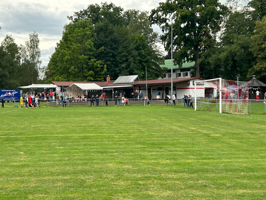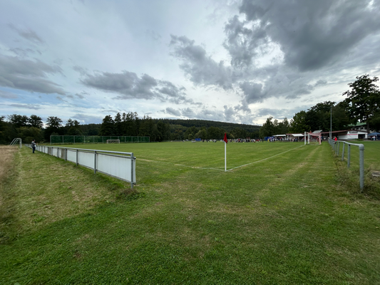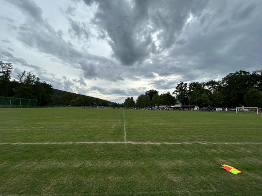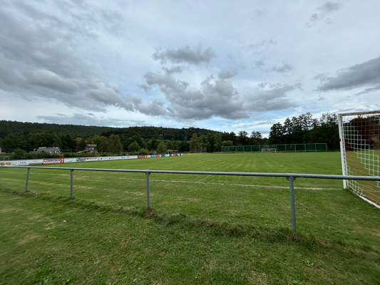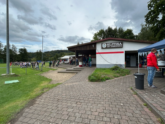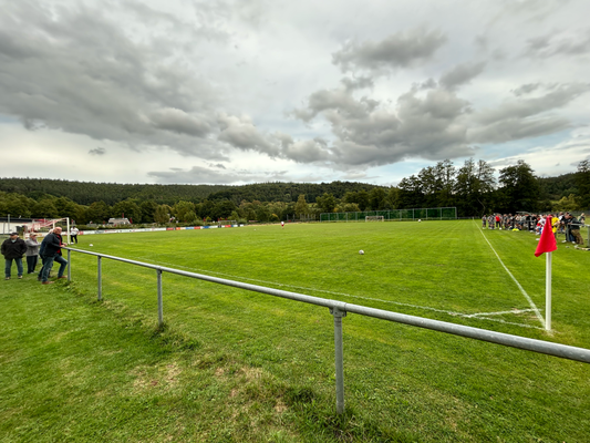 Exakt fünf Minuten nach Abpfiff, also um 15:59 Uhr. fuhren wir in Thüringen weg. Das Navi sagte für die 145 Kilometer eine Fahrzeit 1:29 Stunden voraus, aber auf dem Weg zur Autobahnauffahrt und dem Stück A38 gab ich ein wenig Gas und aus -1 fiel die Zeit bereits auf -5. Am Dreieck Drammetal wechselten wir auf die A7 und bei Kassel waren schon bei sieben Minuten Puffer, also nahm ich ein klein wenig Tempo raus und fuhr normal weiter, zumal auf der weitere Verkehr auf unserer Strecke übersichtlich erschien. Am Kirchheimer und Hattenbacher Dreieck vorbei, ging es dahinter an der ersten Ausfahrt, also bei Niederaula, vom Highway herunter. Es waren noch 16 Kilometer Landstraßen, die wir hinter uns bringen mussten, aber da auf diesen Straßen auch nichts los war, waren wir komplett entspannt bereits schon gegen 17:20 Uhr am Ground. Da hier heute Oktoberfest war und insgesamt nacheinander vier Spiele stattfanden, mussten wir kurz nach einem Parkplatz suchen, letztendlich war es aber auch recht entspannt. Am Eingang vier Euro gezahlt und in der Kreisoberliga ein Ticket mit Datum und Gegner drauf bekommen - mega gut! Ich drehte direkt meine Fotorunde und nachdem das Spiel begonnen hatte, stellte ich mich neben die Gäste-Bank.
