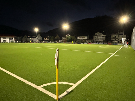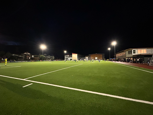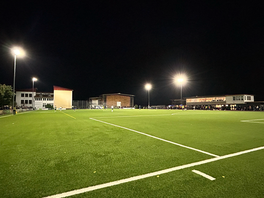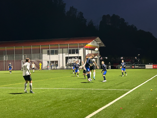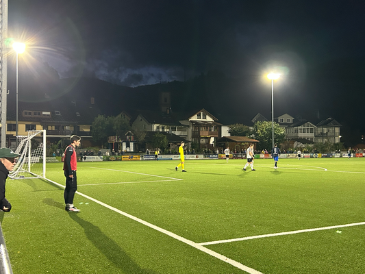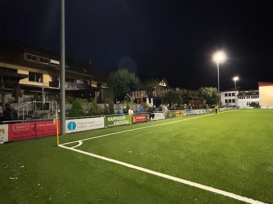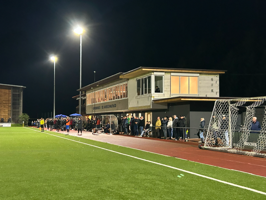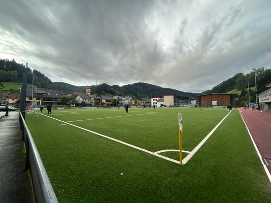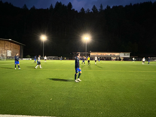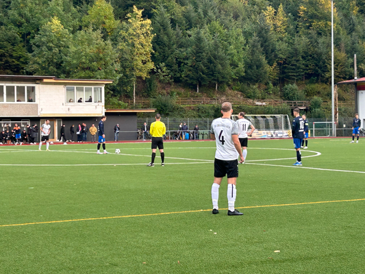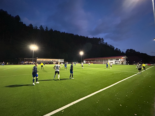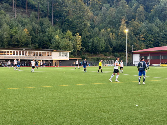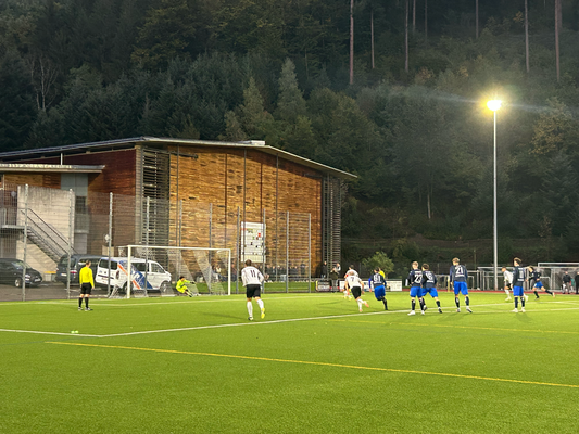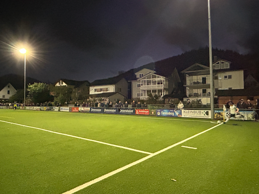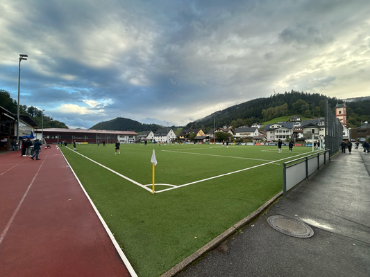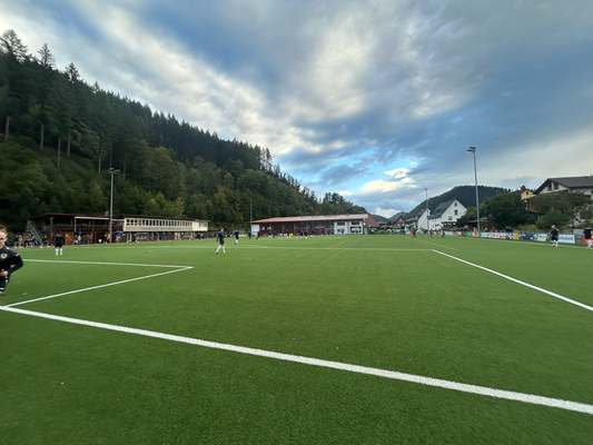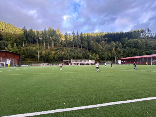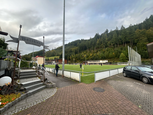 Da ich ja genug Zeit hatte, schaute ich mir noch die Reaktion in unserem Block an, die logischerweise alles andere als positiv war. So war es doch schon 16:10 Uhr am Auto war und nach dem ausziehen der nassen Klamotten fünf Minuten später unterwegs war. Die Strecke betrug zwar nur 67 Kilometer, das Navi sagte aber 1:07 Stunden voraus und ich sah auch schnell warum, denn kurz nachdem ich außerhalb Balingens auf die B27 gefahren war, ging es durch einige Ortschaften in denen überall 30 km/h Begrenzung war und mindestens ein Blitzer, oftmals sogar noch ein Zweiter, schwer nervig. Hinter Rottweil wechselte ich auf die B462, um ab Sulgen mal wieder über ziemlich lustige Straßen zu fahren. Ab Schiltach wurden sie wieder besser, aber ich war auch fast schon an meinem Zielort angekommen. Die Ankunft war um 17:25 Uhr der Fall und ich parkte an der Hauptstraße, war dann nach knapp 100 Metern Fußmarsch kurz darauf am Ground. Meine Runde gedreht, Fotos geschossen usw., blieb auch noch Zeit um mir vorher ein Würstle als Abendessen zu holen. Als ich dieses verhaftet hatte, ging auch das Spiel dann schon los, top Timing.