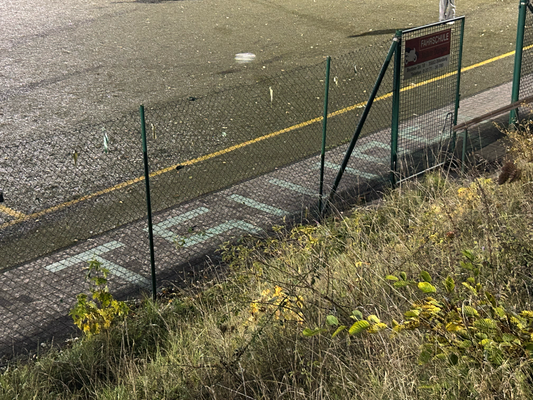Sportgelände um 18:52 Uhr. Geparkt, vier Euro Eintritt gezahlt (dafür eine echt nettes Ticket bekommen) und die eine Längsseite entlang Fotos geschossen, da das Spielfeld unten eingezäunt war