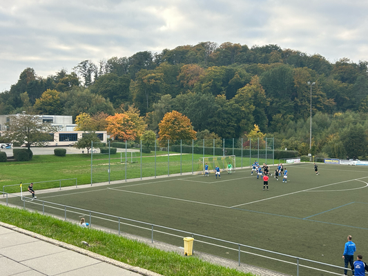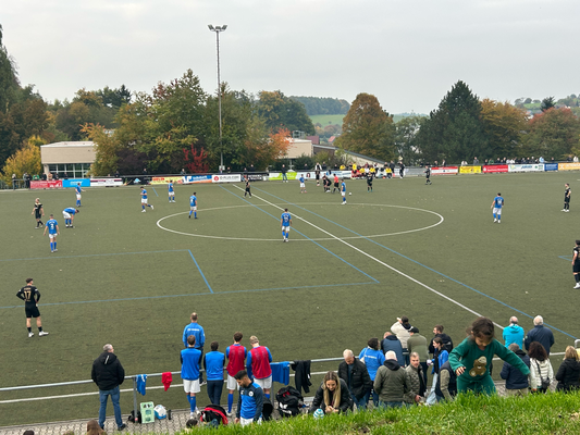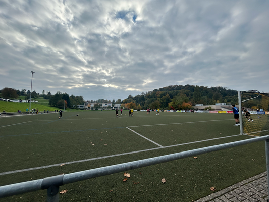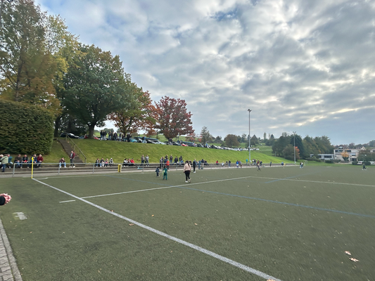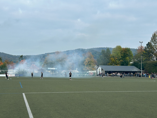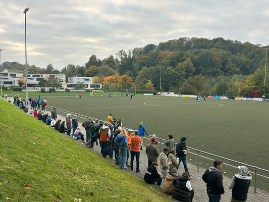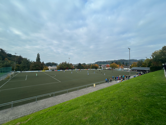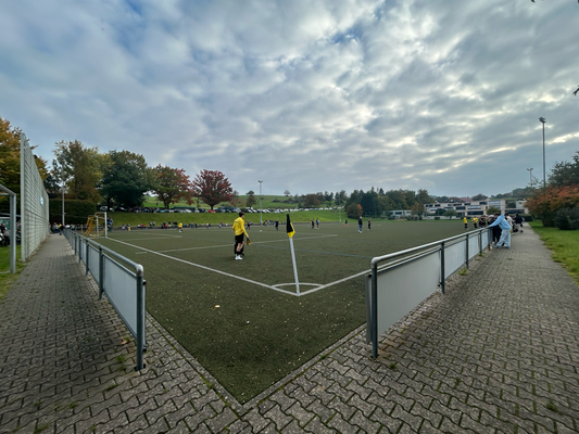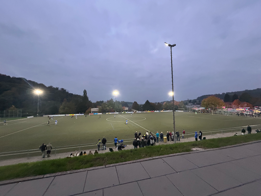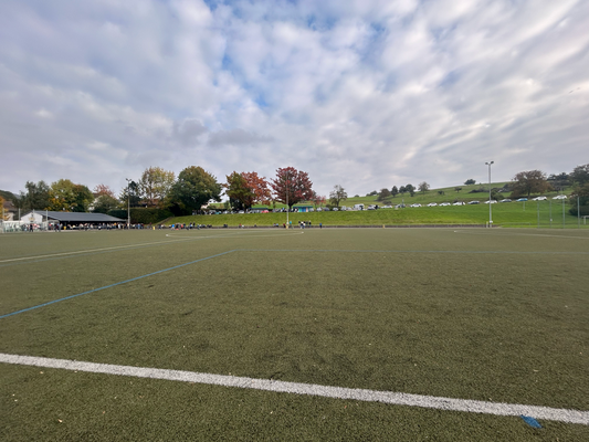 Bushaltestelle oberhalb des Sportgeländes und sah direkt, dass man sich noch in aller Ruhe warm macht und noch Spieler des Zweitmannschaftsspiels zuvor auf dem Rasen saßen. Ich konnte also in