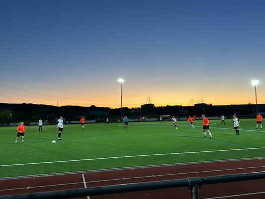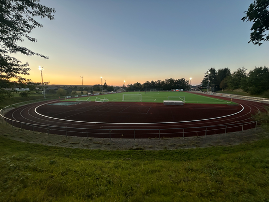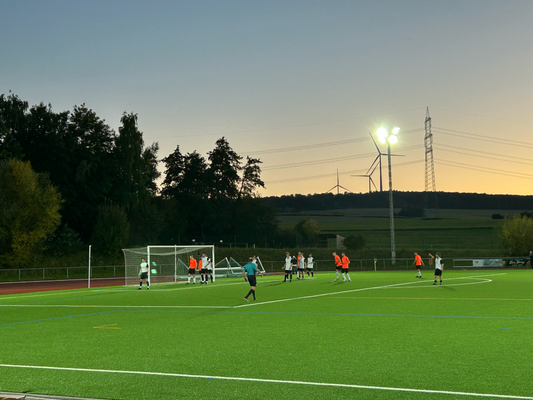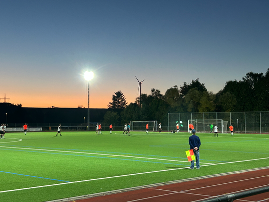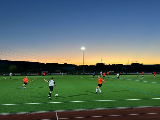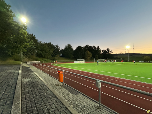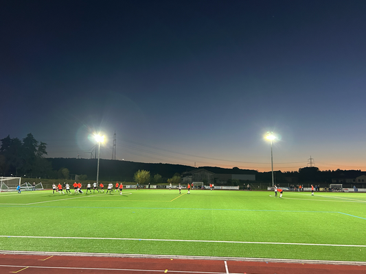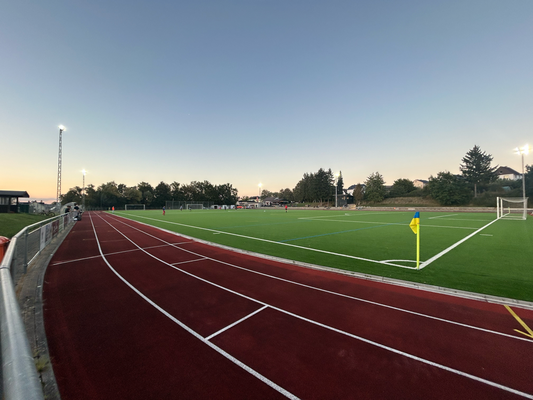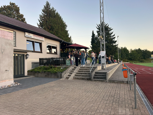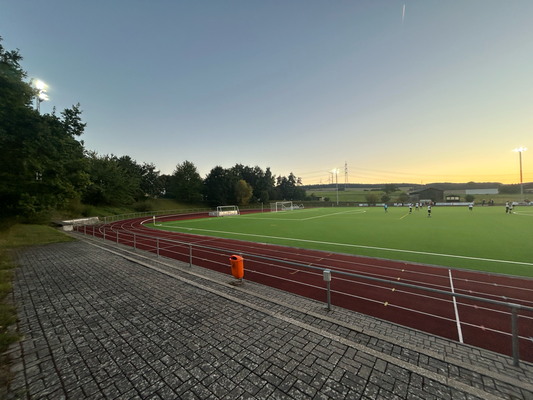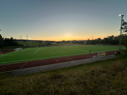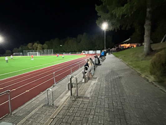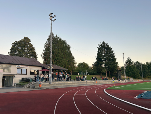Um exakt 18 Uhr startete ich zuhause den Motor und die einfache Strecke, die 112 Kilometer weit war und laut Navi 1:18 Stunden dauern sollte. Quer durch den Taunus wären zwar 20 Kilometer kürzer gewesen, aber es hätte auch eine Viertelstunde länger gedauert, aber darauf hatte ich keine Lust, diese Zeit verbrachte ich lieber auf der Couch. Durch Nidda hindurch ging es bei Berstadt auf die A45, welche bis zur Abfahrt Wetzlar-Ost benutzt wurde, wo ich dann auf die B49 wechselte. Die Querverbindung bis zur A3 bei Limburg brachte ich hinter mich, auch wenn die einspurigen Teilstücke schon nerven, weil man zu diesen Zeitpunkten logischerweise immer einen LKW vor der Nase hat. Nun ja, kostete die ein oder andere Minute, aber halb so wild, ich war ja früh genug unterwegs. Für die Länge von exakt einer Ausfahrt ging es auf jene A3 in Richtung Süden, bevor mich die B417 von Limburg direkt bis zu meinem Zielort brachte. Ich kam um 19:22 Uhr am Sportgelände an und der große Parkplatz davor war komplett gesperrt, weil das Zelt, der Autoscooter usw. für den anstehenden Herbstmarkt aufgebaut wurden, weswegen das Spiel überhaupt auf den heutigen Donnerstag vorgezogen wurde. In den Seitenstraßen waren überall Parkverbotsschilder aufgebaut worden, dieses galt zum Glück aber erst ab morgen und so fand ich glücklicherweise einen Stellplatz. Nach dem Bezahlen von vier Euro Eintritt, war ich drei, vier Minuten vor regulären Spielbeginn im Ground, da aber letztendlich mal wieder mit über fünf Minuten Verspätung angepfiffen wurde. Zu diesem Zeitpunkt saß ich bereits weg vom größten Andrang seitlich auf den zwei Stufen und hatte zuvor meine Fotorunde schon komplett erledigt. Kaum zu glauben nach dem Mistwetter Anfang der Woche, dass ich jetzt die erste Halbzeit komplett noch im T-Shirt hier verweilen konnte.